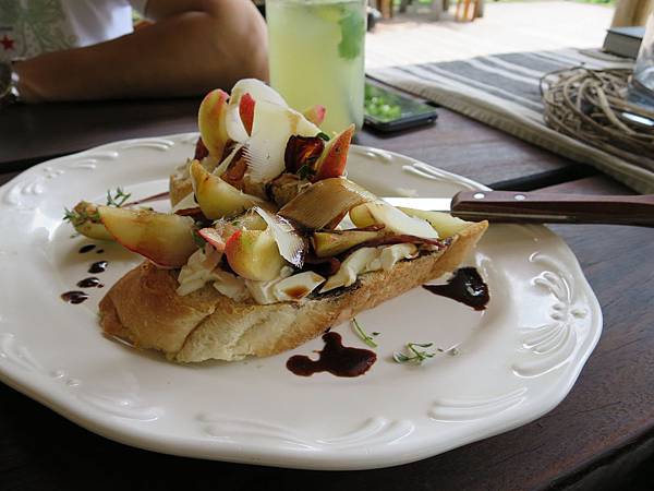 麵包和水果之間又有一層卡士達,但是麵包跟培根好硬XD好怕把盤子切破....